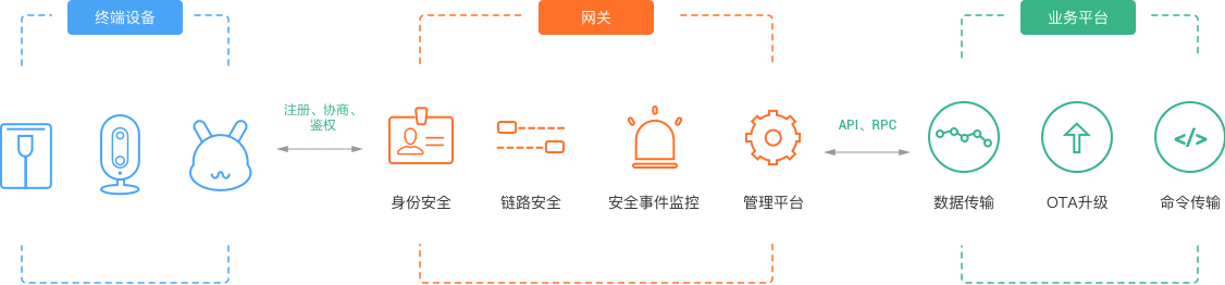 青莲云提供出色智能的设备安全入网能力, 覆盖设备授权、身份鉴权、密钥管理、加密传输、会话管理、数据签名等多种功能,保护物联网设备及数据免受重放攻击、伪造攻击、数据篡改、会话劫持等网络攻击。并通过安全API和RPC系统调用与企业后端业务平台无缝集成,保障整个通信链路的安全和数据完整性。